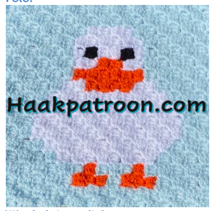 Het haakpatroon van De Witte Eend is nr 27 van de 36-delige dieren lapjesdeken. Het lapje op de foto is gehaakt met de C2C techniek, verschillende kleuren acryl brei-/haakgaren en haaknaald 3,5 mm.